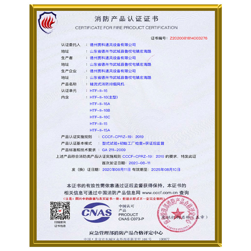 HTF排煙風(fēng)機(jī)3C證書